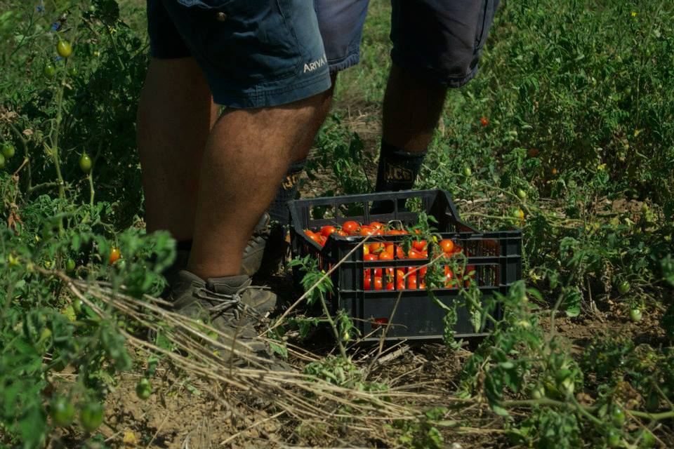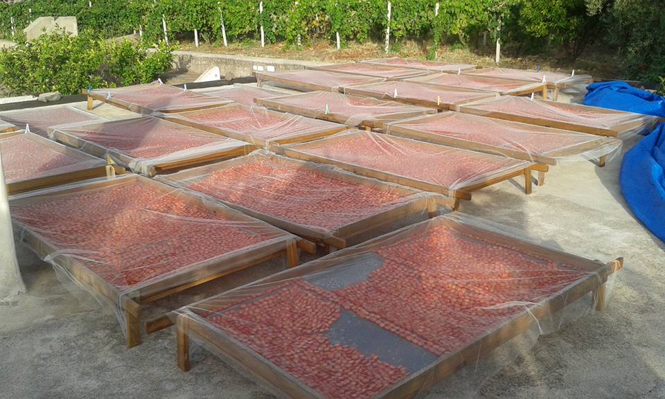 La lavorazione del pomodoro richiede molta manodopera durante i mesi di luglio e agosto: all’alba si effettua la raccolta, subito dopo i pomodori seccagni vengono lavati, tagliati a mano a metà senza separarli, come tradizione siciliana insegna. Una volta sistemati su dei cannizzi vengono salati con sale marino finissimo e stesi al sole per due giorni circa. Saranno così pronti per essere trasferiti in laboratorio per le varie fasi di lavorazione. Si otterranno così dei pomodori secchi sott’olio, il paté di pomodori secchi ed il pesto di capperi con pomodori secchi, mandorle e basilico. A settembre, quando il sole è oramai mite, ci dedichiamo alla produzione dei Pumamuri, pomodori freschi appena raccolti, immersi in acqua calda e sale e pastorizzati in vasetti.
