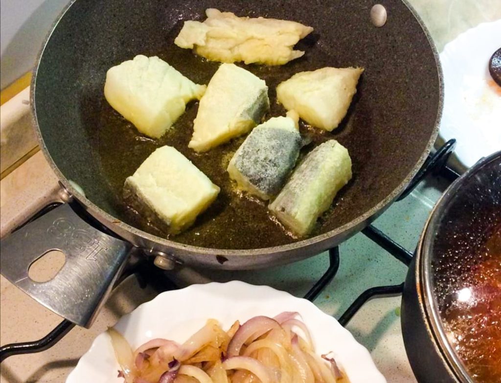 Quando le cipolle si saranno imbiondite aggiungete il pomodoro pelato e i pezzi di baccalà;