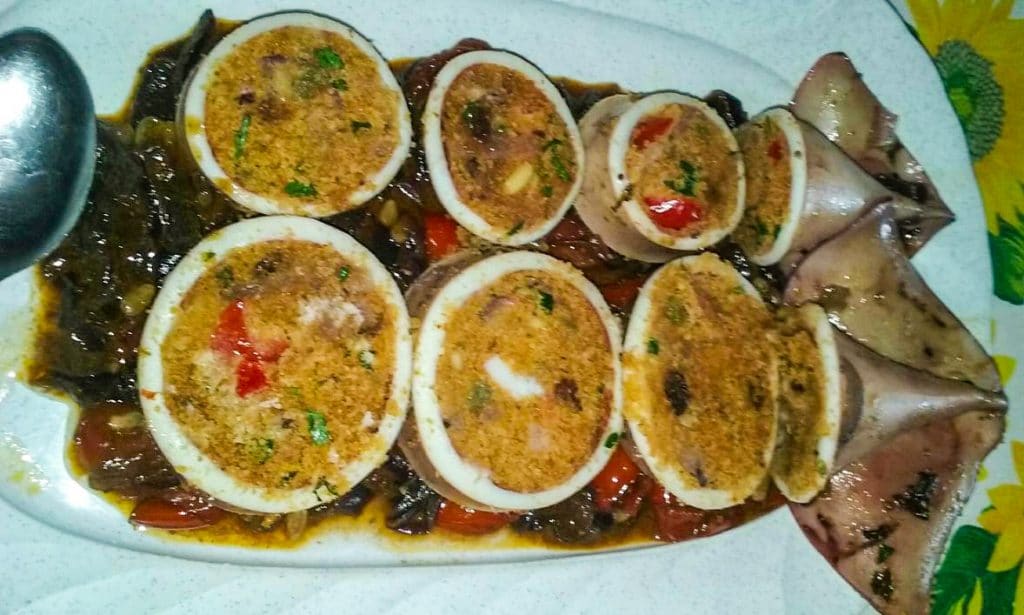 Procedimento: pulire i totani lavandoli sotto l’acqua fredda corrente, svuotate per bene l’interno del corpo del totano. Asportate i tentacoli e lasciate intero il cappuccio che poi riempirete. Tagliate i tentacoli a pezzetti molto piccoli e fateli rosolare in abbondante olio extra vergine di oliva precedentemente scaldato. Salate e sfumate con il vino bianco. In un’altra padella, fate soffriggere 2 spicchi d’aglio a fuoco basso. Quando l’aglio sarà dorato, aggiungete la salsa di pomodoro. Insaporite la salsa con il prezzemolo tritato, un po’ di sale marino ed origano delle Eolie. Lasciate cuocere la salsa per circa 10 mn. Mentre la salsa cuoce, preparate il ripieno con i tentacoli tagliati a pezzetti e rosolati, il pan grattato, le olive verdi tagliate a pezzetti, il pepe nero, i capperi dissalati tritati ed il pomodoro secco seccagno di Salina tagliato sottile. Insaporite il tutto con il sale al cappero d’Amico. La consistenza del ripieno deve essere compatta. Riempite il cappuccio del Totano e chiudete l’estremità con uno stuzzicadenti per evitare che il ripieno fuoriesca in cottura. Trasferite i totani ripieni nella padella con la salsa e fate cuocere per circa 20 mn a fiamma bassa.