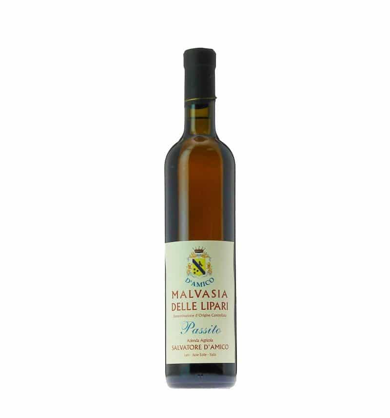 La Malvasia delle Lipari BIO Passito DOC, dell’Azienda vinicola d’Amico, prodotta nell’Isola di Salina, è un vino dolce derivato da uve Malvasia in purezza o con l’aggiunta di massimo il 5% di Corinto nero. L’uva viene lasciata maturare sulla pianta e solo dopo la raccolta viene esposta al sole e fatta appassire per perdere l’acqua rimanente. Di colore giallo con riflessi ambrati, profumo di albicocca, datteri, miele e frutta secca, il sapore è piacevolmente dolce ma non stucchevole, con retrogusto di albicocca e mandorla amara. Eccellente vino da dessert, ottimo da abbinare ai tipici biscottini al sesamo oppure a diverse varietà di dolci e piccola pasticceria.